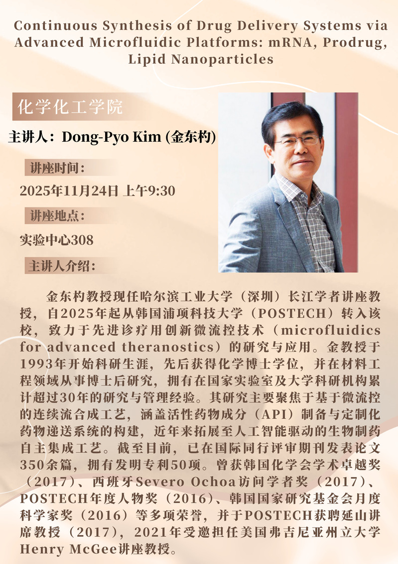 Dong-Pyo Kim(金东杓)教授学术报告预告:Continuous Synthesis of Drug Delivery Systems via Advanced Microfluidic Platforms: mRNA, Prodrug, Lipid Nanoparticles